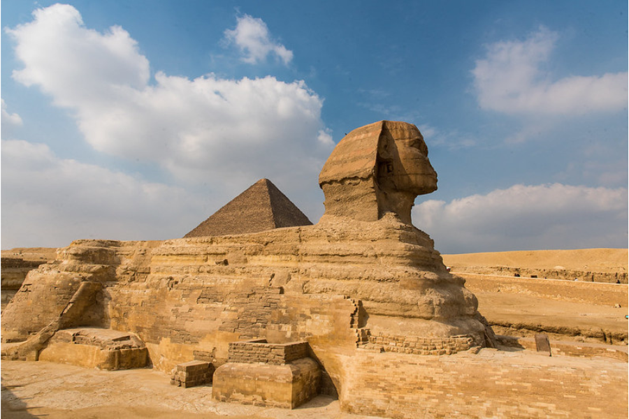 The Sphinx, carved from a single limestone ridge, represents the body of a lion and the head of Pharaoh Khafre. Measuring 73 meters in length and 20 meters in height, it has guarded the Giza Plateau for millennia as a symbol of power and mystery.