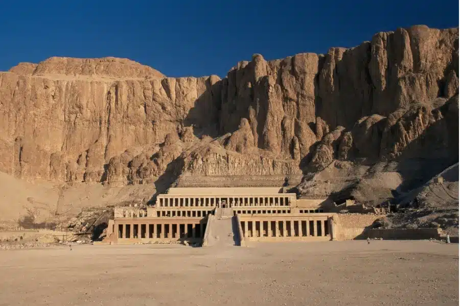 Next, you visit the temple of Hatshepsut. The terraces rise straight from the cliffs, and the place feels wide and calm. Your guide points out the main sections and the story behind the queen who built it.