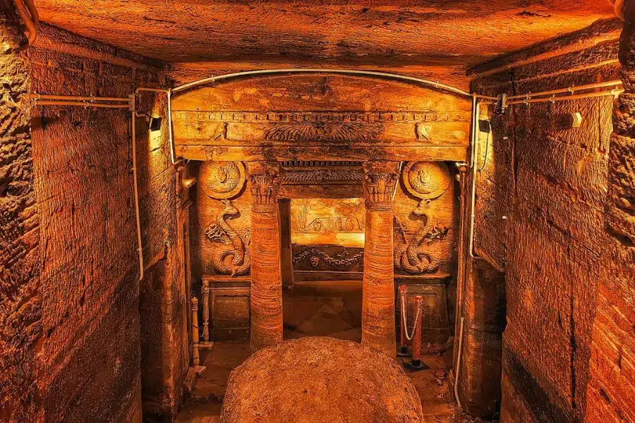 For your final visit, you’ll descend into the Catacombs of Kom El Shoqafa. Beneath the city, the quiet chambers reveal a fascinating blend of Egyptian, Greek, and Roman artistic styles, making this site truly unique to Alexandria.