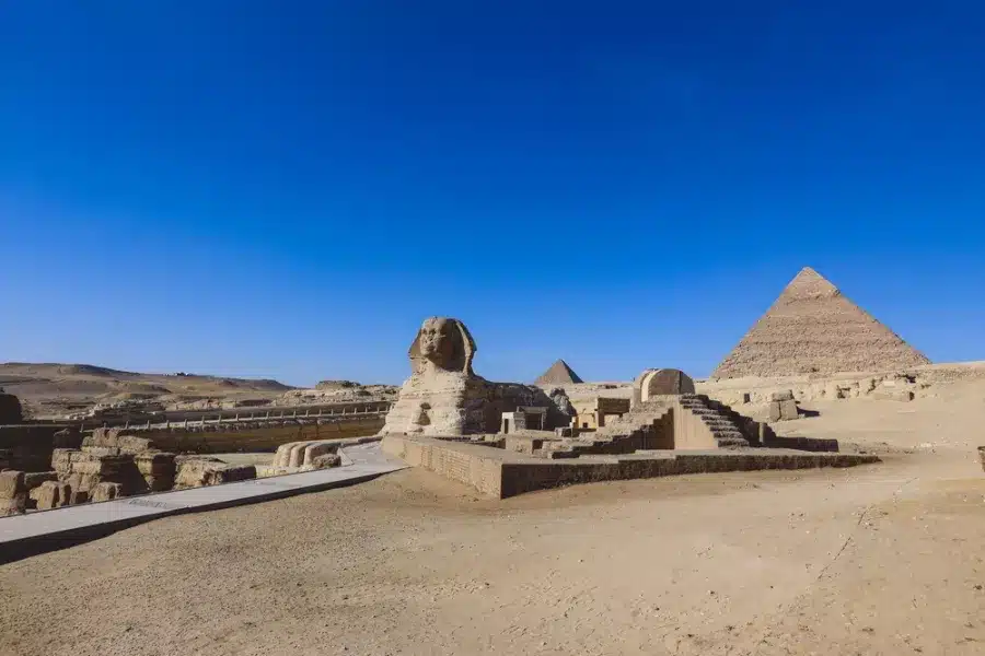 Admire the timeless guardian of the pyramids, with its lion’s body and human face, standing in silence and greatness as one of the most iconic symbols of ancient Egypt.